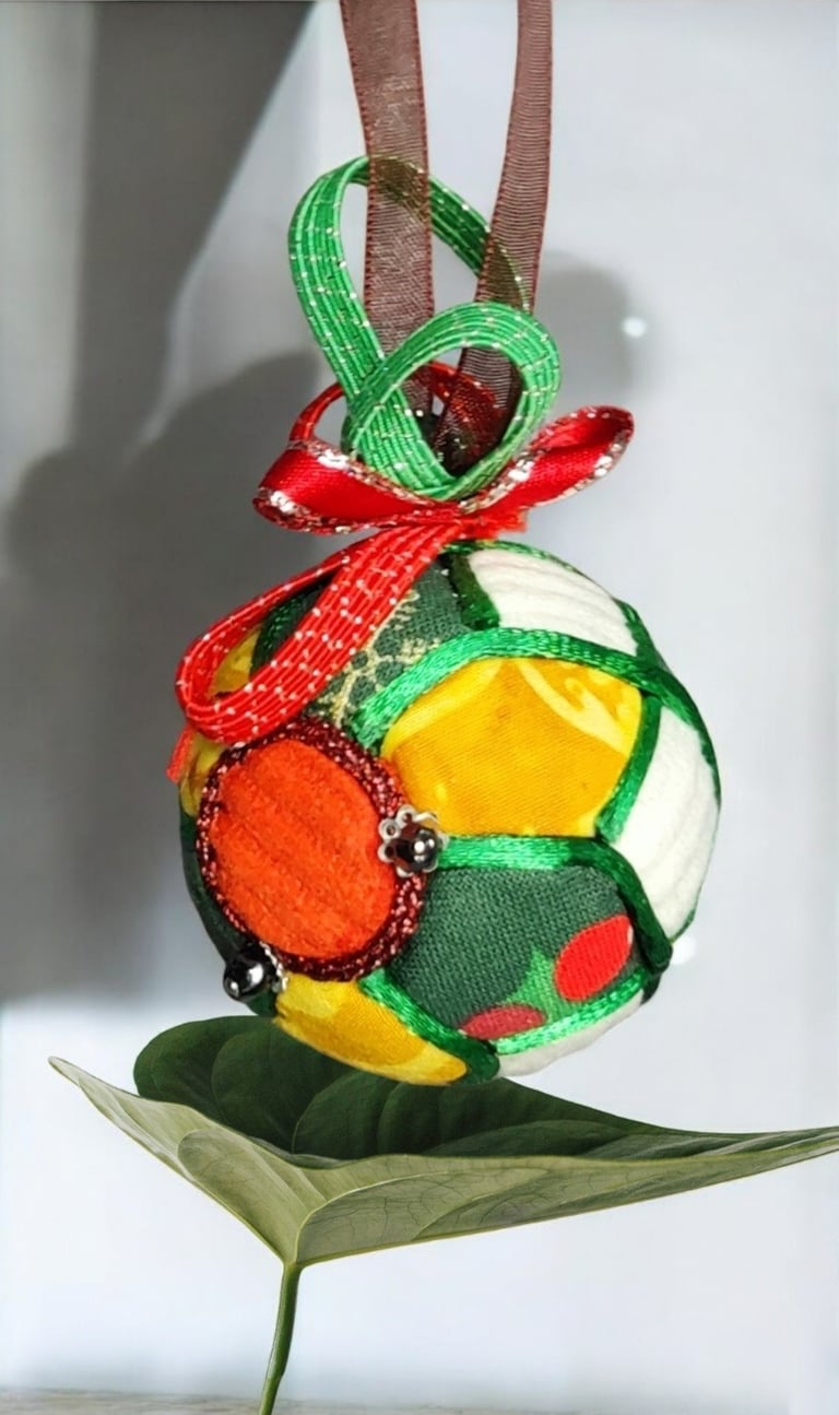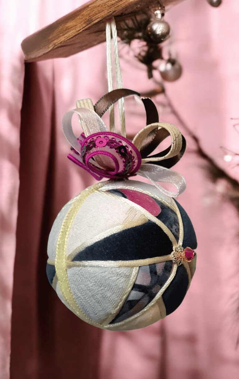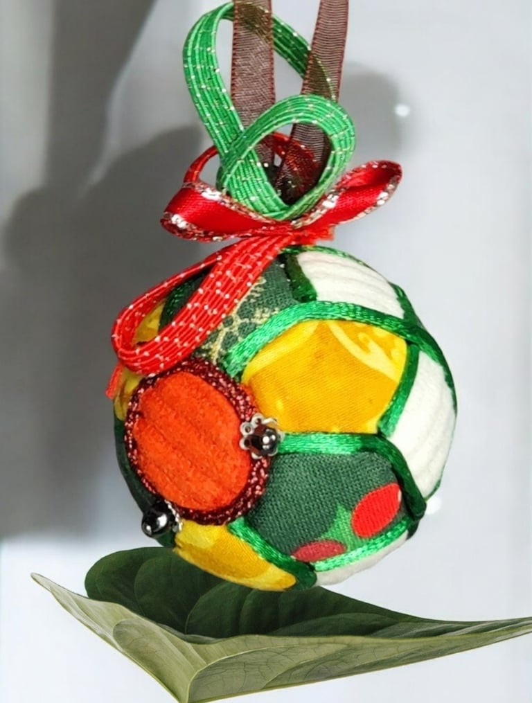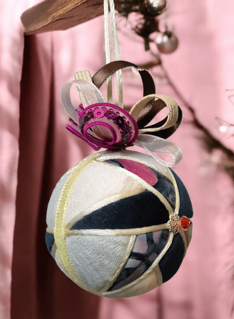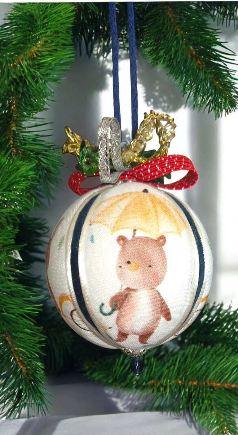 Ici, la boule "Ourson", réalisée selon la technique Kimekomi qui consiste à fabriquer à partir d'une matière basique - ici une boule en polystyrène - un objet sophistiqué et raffiné, en l'habillant de tissu, de fil et de cordon tressé, de ruban soyeux et de perles de pâte de verre et cristal.