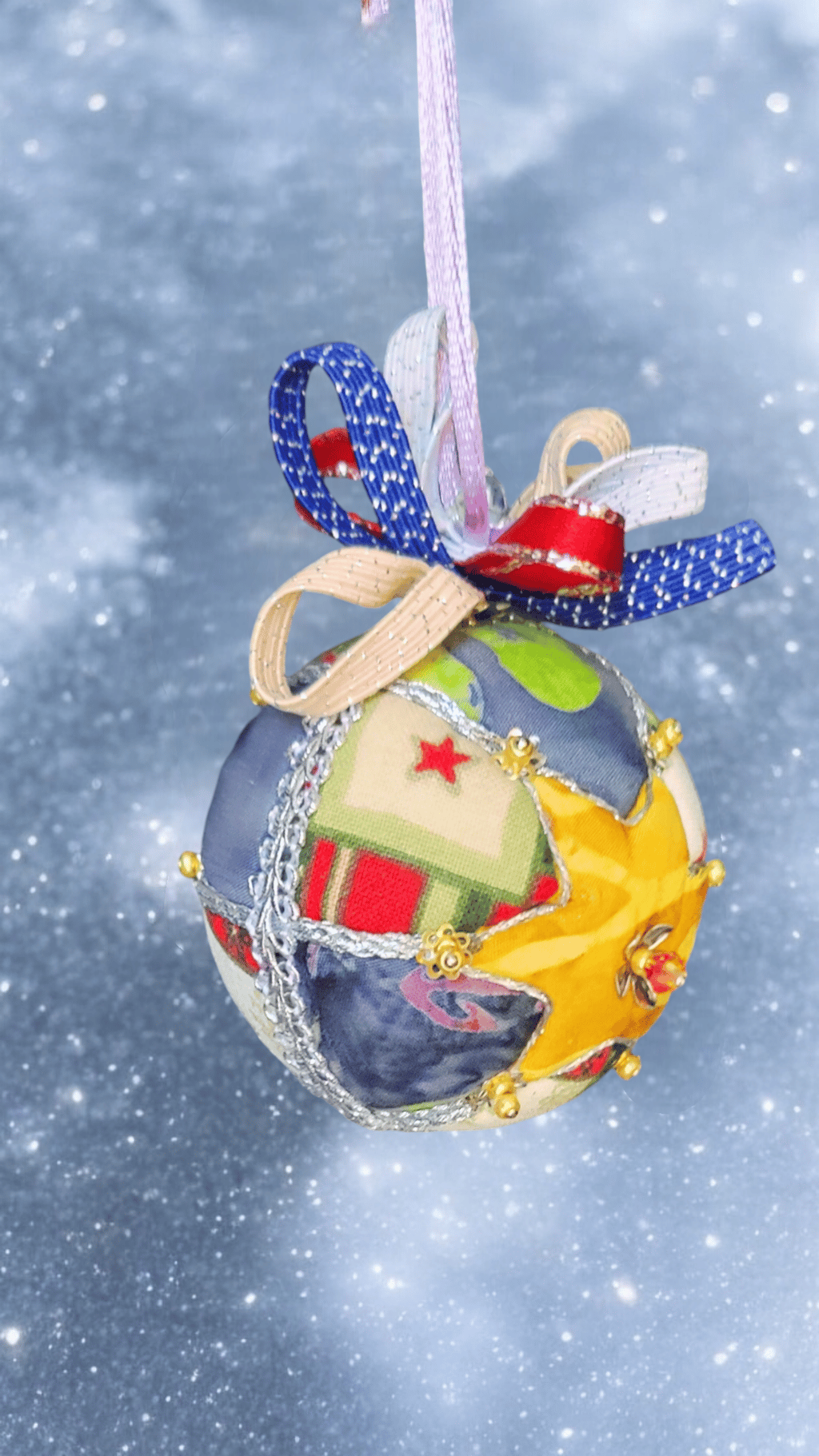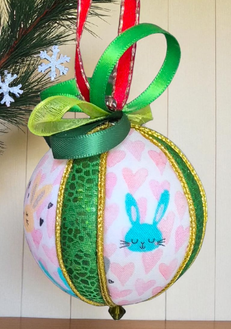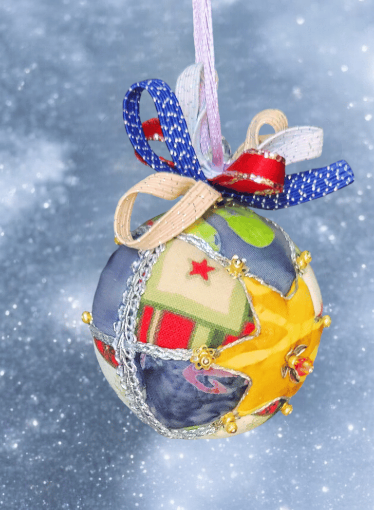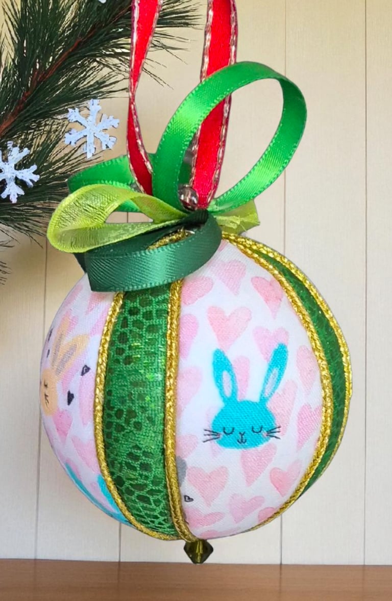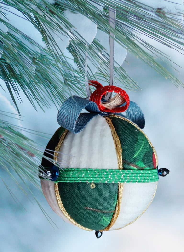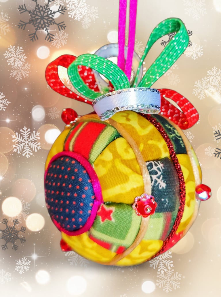 Ici, la boule "Ourson", réalisée selon la technique Kimekomi qui consiste à fabriquer à partir d'une matière basique - ici une boule en polystyrène - un objet sophistiqué et raffiné, en l'habillant de tissu, de fil et de cordon tressé, de ruban soyeux et de perles de pâte de verre et cristal.