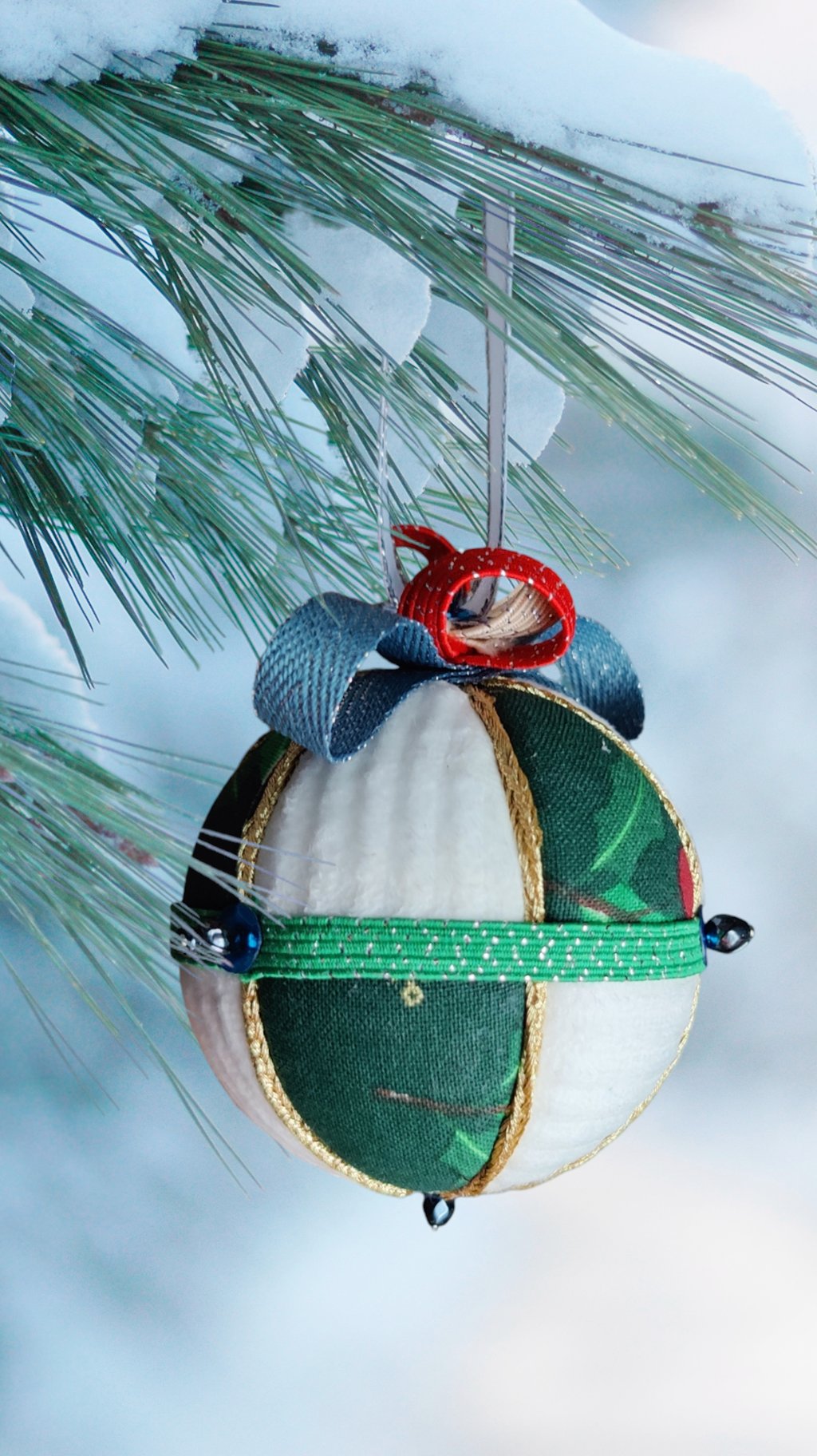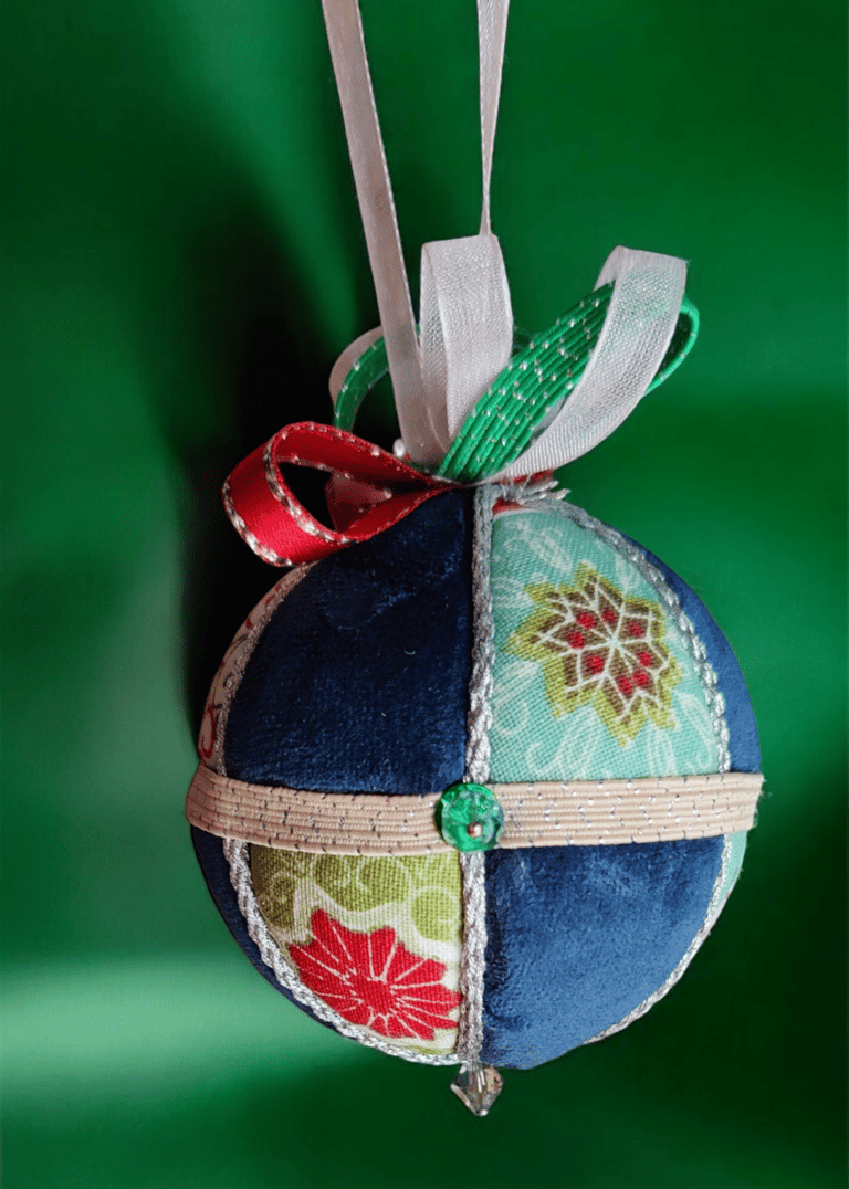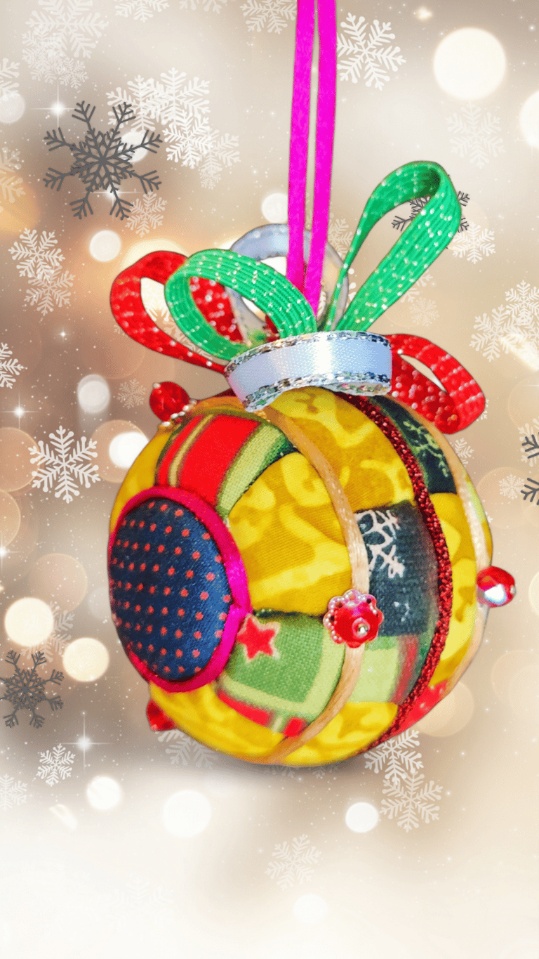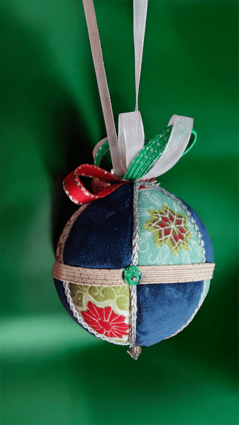 Ici, la boule "Ourson", réalisée selon la technique Kimekomi qui consiste à fabriquer à partir d'une matière basique - ici une boule en polystyrène - un objet sophistiqué et raffiné, en l'habillant de tissu, de fil et de cordon tressé, de ruban soyeux et de perles de pâte de verre et cristal.