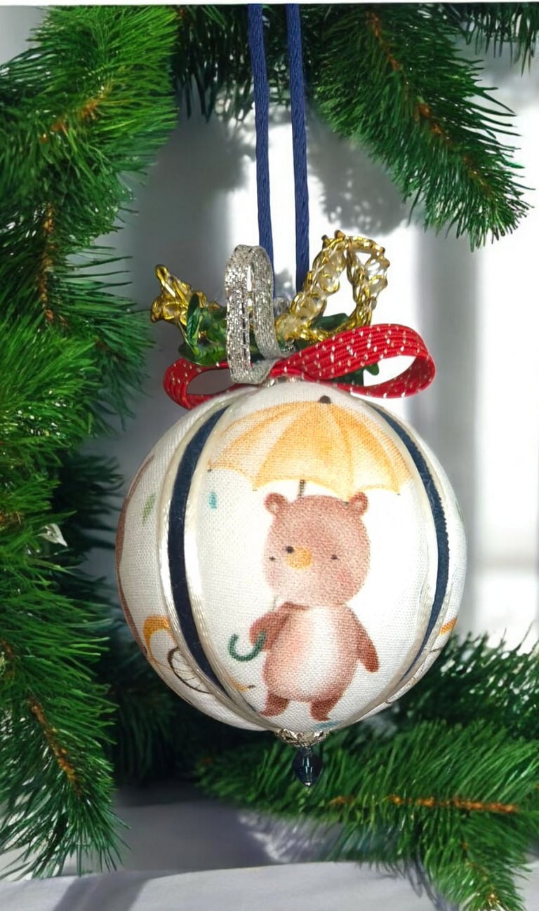 Matière : Boule polystyrène, coton motifs ourson au parapluie, ourson en vélo, tissu velours bleu marine, cordon satiné blanc nacré, rubans, sequins, perles Swarovski couleur grenat .